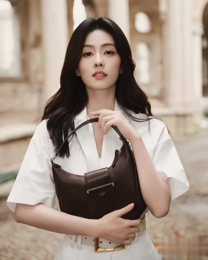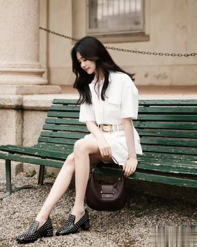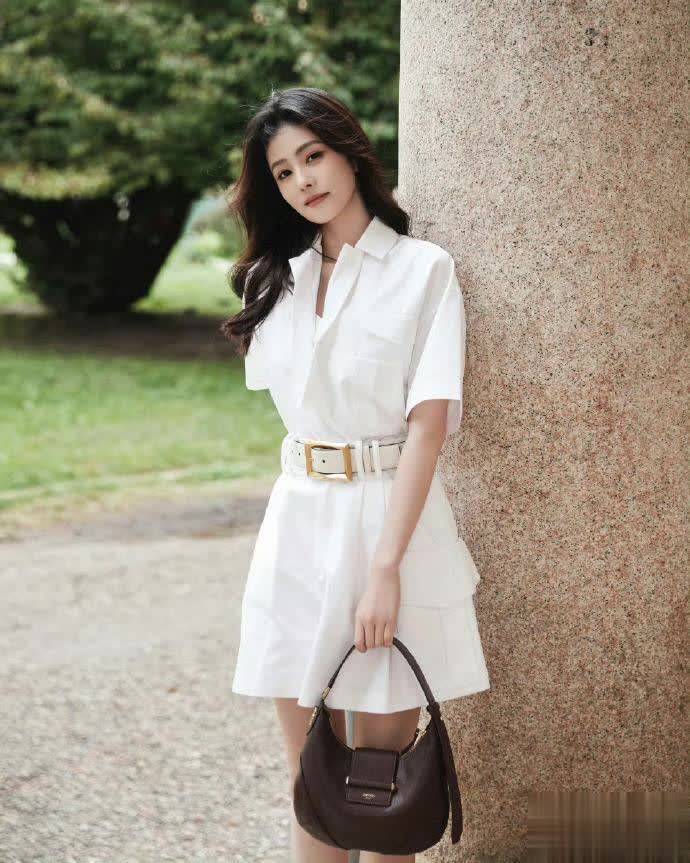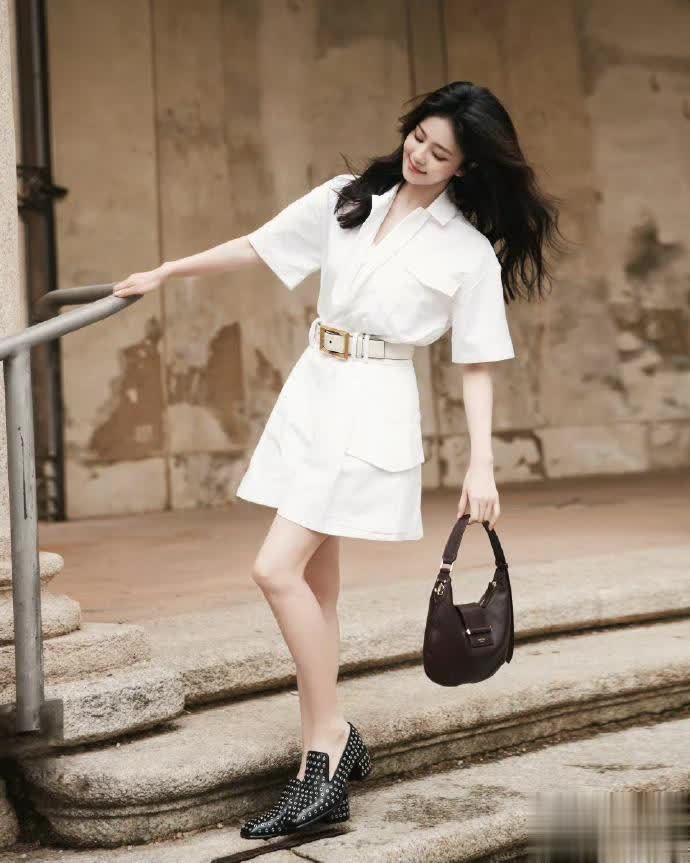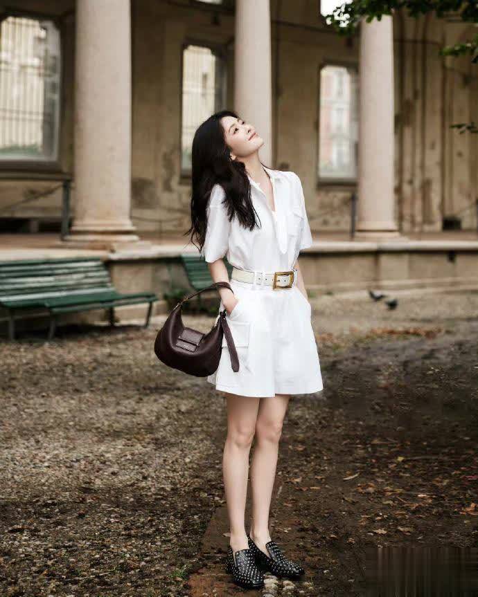 斑驳的暖色调石墙前,白鹿一袭白色短袖连衣裙迎风而立。腰间金色方扣腰带巧妙勾勒曼妙曲线,深紫色手提包与黑色铆钉鞋的碰撞恰到好处。她轻扶栏杆回眸的瞬间,仿佛从复古电影走出的女主角,用极简配色演绎出高级时尚感。